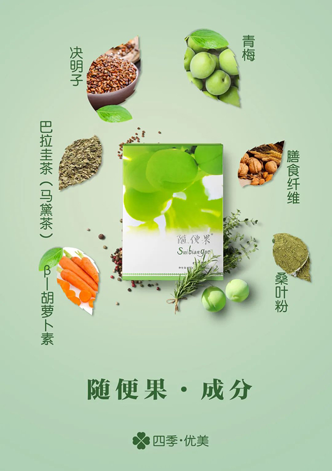 隨便果以梅為胚,輔以桑葉粉、決明子粉、膳食纖維、巴拉圭茶(馬黛茶)提取物、β-胡蘿卜素等多種草本精華,配方簡單干凈,同時順利通過國內外多個第三方機構的質量檢測,“天然、安全、放心”,是全球120多個國家的“果粉”們給出的高分評價。