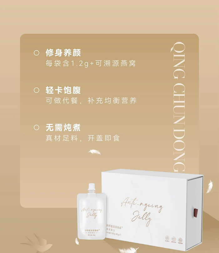 偶爾想給自己輕養一下,含有1.2克可溯源干燕窩的四季優美青春凍吸粉不少,除了實打實的燕窩,還有魚膠原蛋白肽、葛根粉、奇亞籽、水蘇糖、低聚木糖、低聚果糖等多種原料的加持,為追求“清、調、補、養”的你帶來更多驚喜;