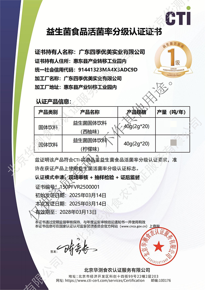 近日,養顧問益生菌固體飲料成功獲得益生菌食品活菌率分級認證一級證書。實驗顯示:在嚴格模擬日常保存條件下,且儲存達三分之一保質期時,其活菌率依然保持≥50%的卓越水平,這意味著每條養顧問益生菌都能兌現“出廠承諾”,真正實現“長效守護”。